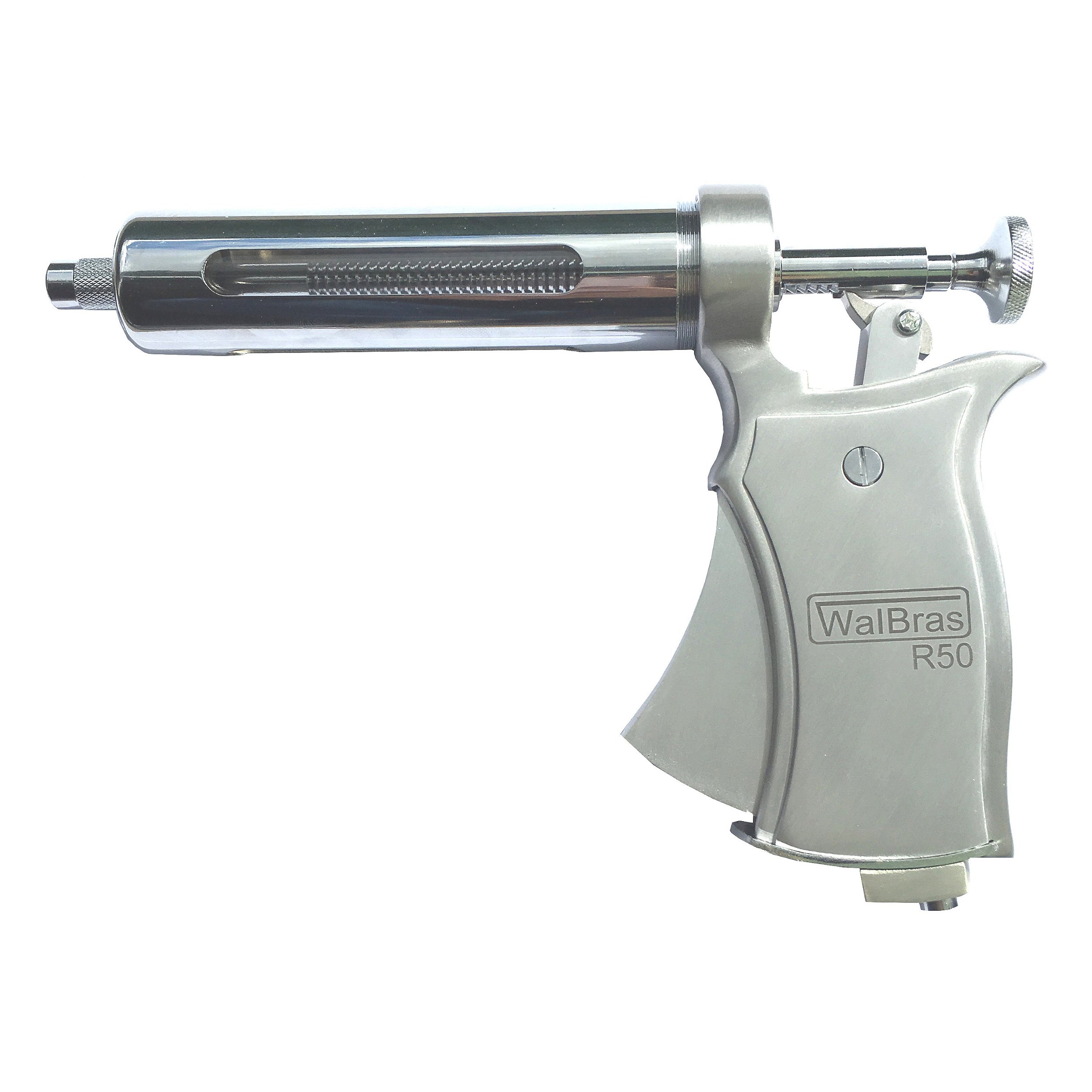 O vacinador automático seringa pistola R50 da Walbras, fabricado pela Walmur, oferece precisão e praticidade na vacinação de gado. Conta com empunhadura tipo cabo fechado e peças compatíveis com diversos modelos de seringas do mercado.